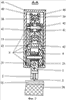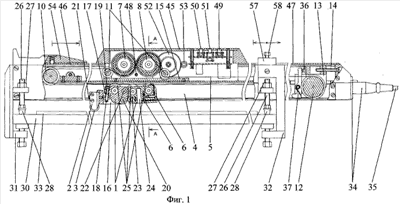 Корпус каретки 1 состоит из двух частей, соединенных осью излома 22 и подпружиненных относительно друг друга разжимной пружиной 23. На фиг.1, в корпусе каретки 1, показано вспомогательное отверстие 24. Каретка 1 снабжена шестью коническими колесами 25 и расположена в полости направляющей 4, которая выполнена с учетом геометрии конических колес 25, как показано на фиг.2.