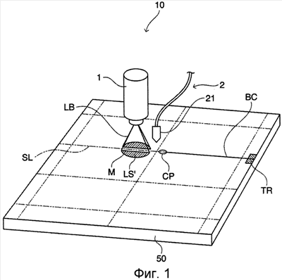 [0047] Согласно описанному выше в пятне LS’ луча энергия облучения, поступающая на участок по линии SL, вдоль которой нужно разделить материал, может поддерживаться очень низкой по сравнению с традиционными пятнами LS0 и