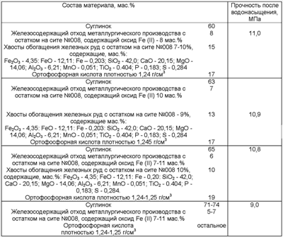 Анализ таблицы показывает, что дополнительное использование хвостов обогащения железных руд с остатком на сите 008 7-10%, содержащих, мас.%: Fe2O3 – 4,35; FeO – 12,11; Fe2+ – 0,203; SiO2 – 42,0; CaO – 0,15; MgO – 14,06; Al2O3 – 6,21; MnO – 0,051; TiO2 – 0.404; P5+ – 0,183; S – 0,284, дает возможность повысить прочность глинофосфатного материала по сравнению с прототипом.