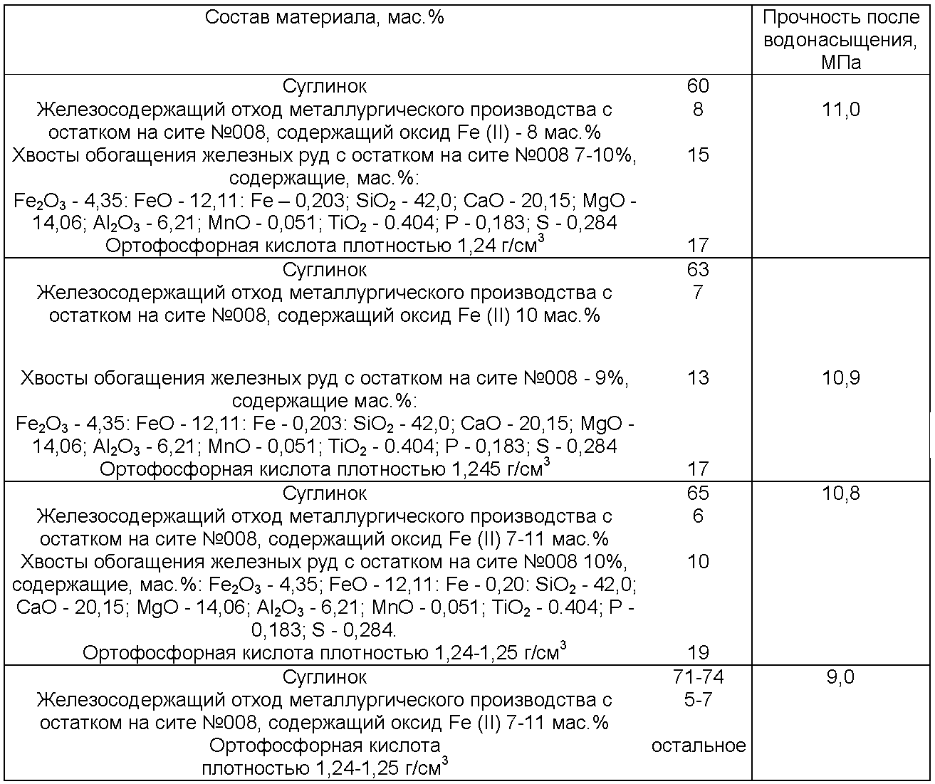 Изготовление материала. Смесь, состоящую из суглинка, железосодержащего отхода металлургического производства с остатком на сите 008, содержащего оксид Fe(II) 7-11 мас.% и хвосты обогащения Коршуновского горнообогатительного комплекса Иркутской области, перемешивают и затворяют ортофосфорной кислотой плотностью 1,24-1,25 г/см. Используют следующие материалы: железосодержащий отход следующего основного состава, мас.%: FeO – 96; CuO – 0,1; Al2O3 – 0,4; Mo3O4 – 0,1; NiO – 0,2; SiO2 – 2,0; Cr2O3 – 0,3; С – 0,3; суглинок; ортофосфорную кислоту плотностью 1,24-1,25 г/см3 (ГОСТ 65-52-80), хвосты обогащения железных руд Коршуновского горно-обогатительного комплекса Иркутской области, с остатком на сите 008 7-10%, содержащие, мас.%: Fe2O3 – 4,35; FeO – 12,11; Fe2+ – 0,203; SiO2 – 42,0; CaO – 20,15; MgO – 14,06; Al2O3 – 6,21; MnO – 0,051; TiO2 – 0.404; P5+ – 0,183; S – 0,284.