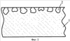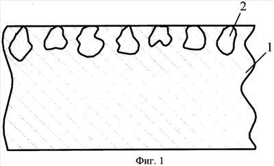 Сформованный таким образом материал охлаждали до температуры порядка 25÷30°С в той же графитовой пресс-форме. В результате была получена подложка, с верхним слоем 2, содержащим частички металла, толщиной 50 мкм (фиг.1). В данном слое частички металлического порошка оказываются размещенными заподлицо с поверхностью керамической подложки так, как показано на фиг.1. При этом частички металла в предыдущем слое после спекания оказываются практически полностью затопленными в керамическом слое. Поэтому площадь контакта частиц с покрываемым слоем металла оказывается незначительной. Для повышения площади контакта методом шлифования с поверхности подложки, содержащей металлические примеси, снимали слой, соответствующий примерно трети размера зерен металлического порошка (фиг.2). При такой обработке частички металлического порошка почти на две трети по размеру оказываются включенными непосредственно в структуру керамической подложки и прочно удерживаются в нем этой же структурой. После процесса шлифования на образовавшуюся поверхность керамической подложки наносили покрытие из меди. Данный процесс осуществляли методом вакуумного напыления с использованием установки УВН-2М-2 с последующим фотонным отжигом и охлаждением в среде инертного газа. Напыление меди осуществляли при давлении 10-4 Па. При этом толщину слоя меди на поверхности керамического элемента контролировали по сопротивлению спутника.
