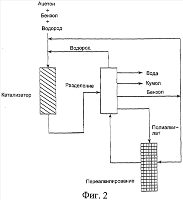 В соответствии со способом, заявляемым в настоящем документе, и в соответствии с одним из воплощений изобретения со ссылкой на Фиг.2 бензол, ацетон и водород реагируют в течение одной операции в присутствии описанной каталитической системы и при условиях, указанных для получения продукта реакции, который в основном содержит изопропилбензол, непрореагировавший бензол, непрореагировавший водород, воду и полиизопропилбензолы.