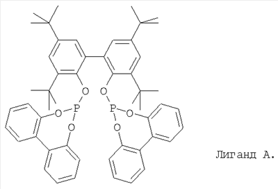 В 100 мл стальной автоклав производства Parr, изготовленный из нержавеющей стали марки «Hastelloy», снабженный устройствами для термостатирования (±0.3°С) и перемешивания (1000 мин-1), помещают раствор 3×10-5 моль дикарбонилацетилацетоната родия {Rh(acac)(CO)2} в п-ксилоле (около 180 ppm в расчете на металлический родий), добавляют лиганд А (формула которого приведена ниже) в расчете 7, 2 и 1 моль на 1 моль Rh (около 1.05, 0.3 и 0.15 вес.%; примеры 1, 2 и 3 соответственно). Автоклав закрывают, продувают азотом (4 раза по 2 МПа), устанавливают давление 0.5 МПа и нагревают до 90°С. После этого давление в автоклаве сбрасывают, вводят 0.148 моль (около 12 мл) жидкого пропилена и доводят общее давление до 2 МПа подачей синтез-газа состава СО:Н2 1:1. Далее давление поддерживают постоянным посредством подачи синтез-газа с помощью электронного измерителя-регулятора давления (Brooks Pressure Controller Model 5866) и определяют количество поглотившегося синтез-газа с помощью электронного измерителя потока (Brooks Mass Flow Meter Model 5850). Скорость реакции вычисляют по наклону начального прямолинейного участка кинетической кривой поглощения синтез-газа (в области конверсии субстрата 0-10%). После 50 мин автоклав охлаждают и определяют выход продуктов с помощью ГЖХ.