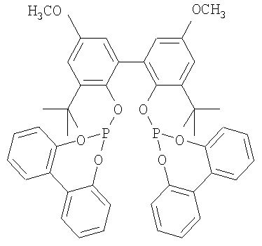 Мольное отношение полифосфитный лиганд/Rh составляет от 1 до 20. При этом верхний предел ограничен как экономическими соображениями (большой расход дорогостоящего лиганда), так и увеличением скорости нежелательного превращения полифосфита в неактивное состояние за счет автокаталитического характера этой реакции. Поэтому целесообразно использовать мольное соотношение полифосфит/Rh не более 4, лучше ~1. Дополнительное преимущество проведения реакции при соотношении полифосфит/Rh=1:1 состоит в том, что в этом случае практически весь полифосфит связан в комплекс с металлом и потому менее подвержен нежелательным превращениям. С целью уменьшения расхода полифосфитного лиганда желательно также подбирать такие концентрации родия, чтобы содержание полифосфита в реакционной смеси составляло менее 0.2 вес.%, лучше менее 0.1 вес.%.