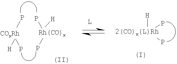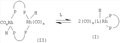 Региоселективный эффект промотирующего лиганда находит рациональное объяснение, если предположить, что в условиях гидроформилирования высокоселективные по линейным альдегидам гидридные комплексы с цис-координированным полифосфитным лигандом (I) могут существовать в равновесии с низкоселективными димерными комплексами типа (II):