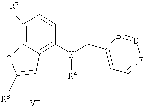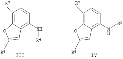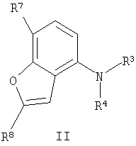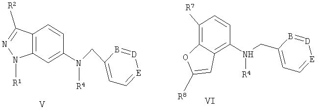 9. Соединение по п.2, которое представляет собой: 7-метокси-2-(2-метил-(1,3-диоксолан-2-ил))-4-[N-(4-пиридилметил)]аминобензофуран, 7-метокси-2-(2-метил-(1,3-диоксолан-2-ил))-4-[N-(3-пиридилметил)]аминобензофуран, 7-метокси-2-(2-метил-(1,3-даоксолан-2-ил))-4-[N-фенил-N-(4-пиридилметил)]аминобензофуран, 7-метокси-2-(2-метил-(1,3-диоксолан-2-ил))-4-[N-(3-цианофенил)-N-(3-пиридилметил)]аминобензофуран, 7-метокси-2-(2-метил-(1,3-диоксолан-2-ил))-4-[N-фенил-N-(3-пиридилметил)]аминобензофуран, 7-метокси-2-(2-метил-(1,3-диоксолан-2-ил))-4-[N-(3-цианофенил)-N-(4-пиридилметил)]аминобензофуран, 7-метокси-2-(2-метил-(1,3-диоксолан-2-ил))-4-[N-(3-цианофенил)-N-(3-пиридилметил)]аминобензофуран, 7-метокси-2-(2-метил-(l,3-диоксолан-2-ил))-4-[N-(4-карбоксифенил)-N-(3-пиридилметил)]аминобензофуран, 7-метокси-2-(2-метил-(1,3-диоксолан-2-ил))-4-[N-(-(2Н-тетразол-5-ил)фенил)-N-(3-пиридилметил)]аминобензофуран, 7-метокси-2-(2-метил-(1,3-диоксолан-2-ил))-4-[N-(4-карбокси-3-хлорфенил)-N-(3-пиридилметил)]аминобензофуран, 7-метокси-2-(2-метил-(1,3-диоксолан-2-ил))-4-[N-(3-карбокси-5-фторфенил)-N-(3-пиридилметил)]аминобензофуран, 1-циклопентил-6-[N-(3-(1,1-диметилэтоксикарбонил)фенил)-N-(3-пиридилметил)]-1Н-аминоиндазол, 2-ацетил-7-метокси-4-(N-(4-цианофенил)-N-(3-пиридилметил))-аминобензофуран, 2-ацетил-7-метокси-4-(N-фенил-N-(4-пиридилметил))аминобензофуран, 2-ацетил-7-метокси-4-(N-(3-карбоксифенил)-N-(3-пиридилметил))аминобензофуран, 7-метокси-2-(2-метил-(1,3-диоксалан-2-ил))-4-(N-(4-цианофенил)-N-(3-пиридилметил))аминобензофуран, 2-ацетил-7-метокси-4-(N-(3-цианофенил)-N-(3-пиридилметил))-аминобензофуран, 2-ацетил-7-метокси-4-(N-фенил-N-(3-пиридилметил))аминобензофуран, 2-ацетил-7-метокси-4-(N-(3-цианофенил)-N-(4-пиридилметил))-аминобензофуран, 2-ацетил-7-метокси-4-(N-(4-ацетилфенил)-N-(3-пиридилметил))-аминобензофуран, 2-ацетил-7-метокси-4-[N-(4-карбоксифенил)-N-(3-пиридилметил))-аминобензофуран, 2-ацетил-7-метокси-4-[N-(4-(2Н-тетразол-5-ил)фенил)-N-(3-пиридилметил))аминобензофуран, 2-ацетил-7-метокси-4-[N-(4-карбокси-3-хлорфенил)-N-(3-пиридилметил))аминобензофуран, 2-ацетил-7-метокси-4-[N-(3-карбокси-5-фторфенил)-N-(3-пиридилметил))аминобензофуран, 2-ацетил-7-метокси-N-(4-фенилсульфониламинокарбонилфенил)-N-(3-пиридилметил)-4-аминобензофуран, или их фармацевтически приемлемые соли, где оптически активные соединения могут быть в форме их разделенных энантиомеров или их смесей, включая рацемические смеси.