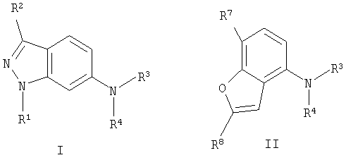 8. Соединение по п.1, которое представляет собой: 1-циклопентил-6-(N-фенил-N-(3-пиридилметил))аминобензофуран, 1-циклопентил-6-(N-(3-карбоксифенил)-N-(3-пиридилметил))аминобензофуран, 6-амино-1-циклопентил-3-этил-6-[N-3-(1,1-диметилэтоксикарбонил)фенил]-N-(3-пиридилметил)амино-1Н-индазол, 1-циклопентил-3-этил-6-[N-(3-карбоксифенил)-N-(3-пиридилметил)]амино-1Н-индазол, или их фармацевтически приемлемые соли, где оптически активные соединения могут быть в форме их разделенных энантиомеров или их смесей, включая рацемические смеси.