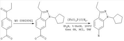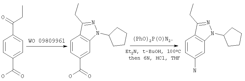 К смеси 1-циклопентил-3-этил-1Н-индазол-6-карбоновой кислоты (258 мг) и триэтиламина (0, 56 мл) в трет.-бутаноле (1 мл) добавляют дифенилфосфорилазид (0,33 мл). Смесь перемешивают при 100°С в течение 4 ч, затем распределяют между водой (25 мл) и эфиром (25 мл). Эфирный слой отделяют, высушивают (MgSO4) и пропускают через слой силикагеля.
