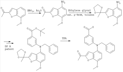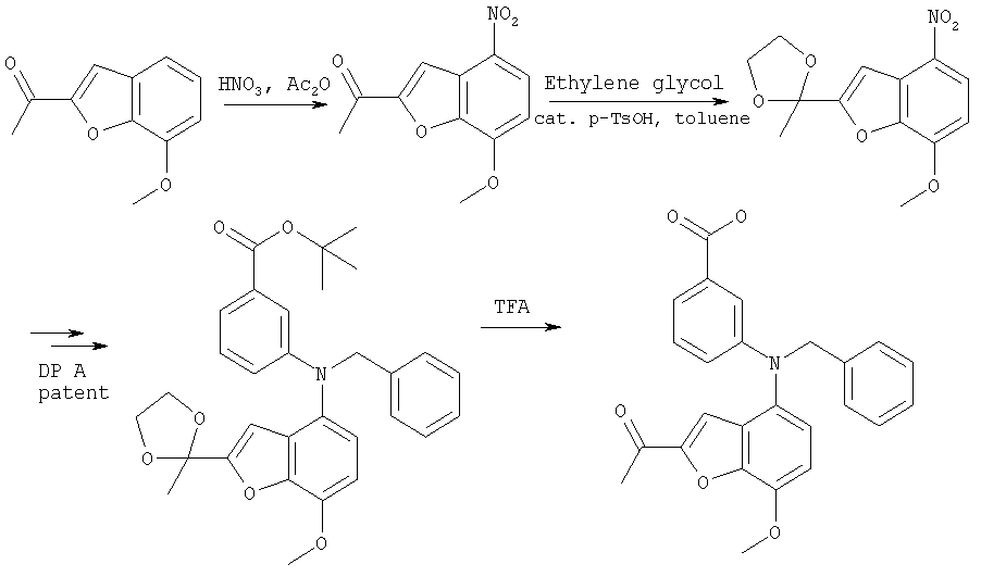 К раствору 2-ацетил-7-метоксибензофурана (4,0 г) в уксусном ангидриде (50 мл) при 0°С добавляют по каплям 70%-ную азотную кислоту (1,5 мл). Смесь нагревают до комнатной температуры и перемешивают в течение 3 ч, затем переносят в охлажденный льдом насыщенный раствор карбоната натрия (200 мл). При перемешивании осторожно добавляют твердый карбонат натрия до основности, соответствующей рН 8. Смесь фильтруют, и твердое вещество отделяют вакуумной фильтрацией. Затем тведое вещество кипятят в 100 мл метанола в течение 1 ч, охлаждают до 0°С и фильтруют, получая 2-ацетил-7-метокси-4-нитробензофуран (2,1 г). ЯМР (300 МГц): 8,29 (d, J=8,9 Гц, 1Н), 8,14 (s, 1H), 7,00 (d, J=8,9 Гц, 1Н), 4,14 (s, 3H), 2,68 (s, 3Н)