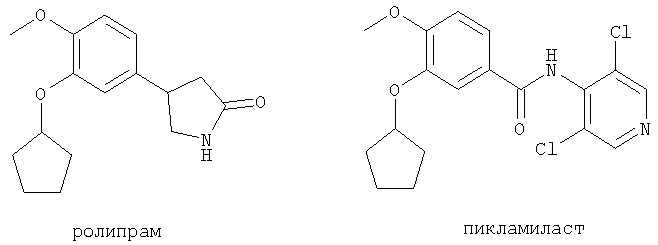 Ролипрам, предпочтительно применяемый, как антидепрессант, селективно ингибирует PDE4 фермент и стал стандартным агентом в классификации подтипов PDE ферментов. Ранние работы в области PDE4 были сосредоточены на лечении депрессии и воспалений, но впоследствии были распространены на болезни, включающие, например, деменцию (слабоумие). (См. “The PDE IV Family Of Calcium-Phosphodiesterases Enzymes,” John A. Lowe, III, et al. Drugs of the Future 1992, 17(9): 799-807 в общем обзоре). Дальнейшие клинические испытания ролипрама и других ингибиторов PDE4 первого поколения были приостановлены из-за побочных эффектов этих соединений. Главным побочным эффектом, обнаруженным на приматах, является вызываемая этими соединениями рвота, в то время, как главным побочным эффектом у грызунов является тестикулярная дегрануляция, ослабление сосудистой гладкой мышцы, психотропные эффекты, увеличение кислой желудочной секреции и желудочная эрозия.