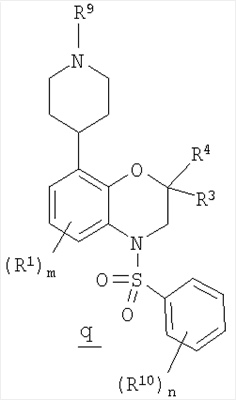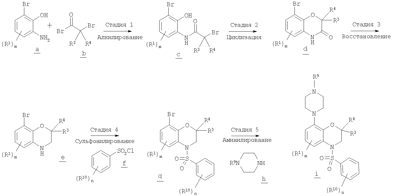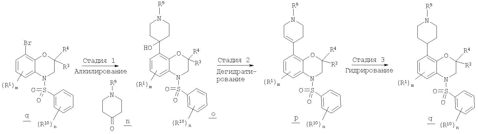 В схеме В на стадии 1 арилсульфонилбензоксазин g (полученный, как показано выше на стадии 4 схемы А) обрабатывают алкиллитием, таким как н-бутиллитий, в безводном полярном апротонном растворителе при охлаждении сухим льдом/ацетоном с образованием промежуточного литийорганического соединения (не показано), где атом брома в соединении g заменен на атом лития. Затем промежуточным литийорганическим соединением алкилируют in situ гетероциклический кетон n с образованием гетероциклилзамещенного арилсульфонилбензоксазина о. Гетероциклический кетон n может включать, например, показанный выше пиперидон или в другом варианте пирролидинон или азепинон, каждый из которых является коммерческим препаратом. Если R9 означает водород, то для защиты экспонированного атома азота в гетероциклическом кетоне n и соответствующего атома азота в гетероциклилзамещенном арилсульфонилбензоксазине о можно использовать ВОС-группу или другие защитные группы.
