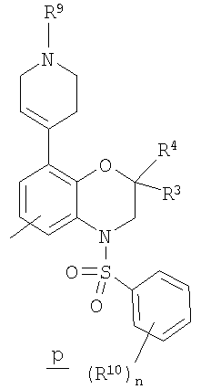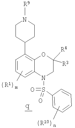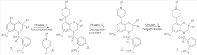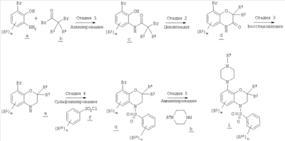 На стадии 2 гетероциклилзамещенный арилсульфонилбензоксазин о дегидратируют при обработке слабой кислотой с образованием соединения р, где гетероциклильный остаток является частично ненасыщенным. В некоторых вариантах такое дегидратирование может проходить самопроизвольно, что исключает стадию 2.