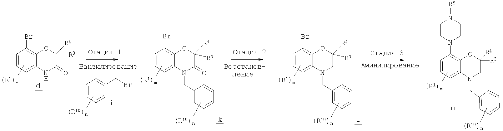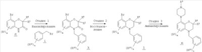 Методику, показанную на схеме В, можно также использовать для получения соединений формулы (I), где Х означает СН, Y означает -СН2-, а R2 означает необязательно замещенный фенил. При этом вместо арилсульфонилбензоксазина g в качестве исходного соединения используется N-бензилбензоксазинон k.