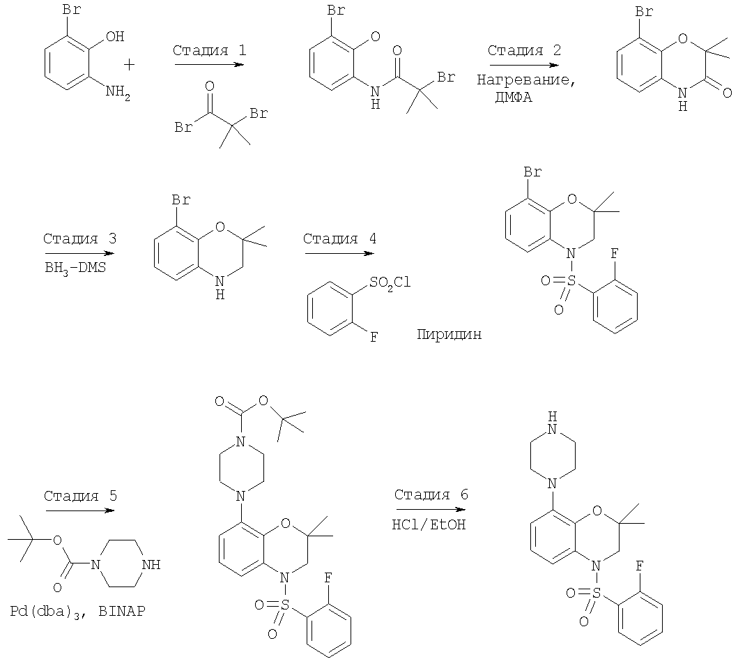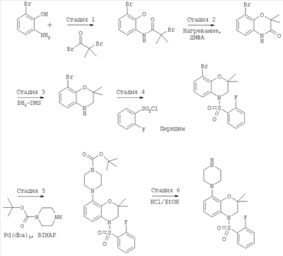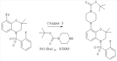 В нагретую дегазированную смесь Pd2(dba)3 (трис(дибензилиденацетон)дипалладий (0), 20,59 мг, 0,022 ммоля), BINAP (2,2′-бис(дифенилфосфино)-1,1′-бинафтил, 35,0 мг, 0,056 ммоля) и t-BuONa (151,26 мг, 1,57 ммоля) в 5 мл толуола добавляли раствор 8-бром-4-(2-фторбензолсульфонил)-2,2-диметил-3,4-дигидро-2Н-бензо[1,4]оксазина (450 мг, 1,124 ммоля) и 1-Вос-пиперазина (209,4 мг, 1,124 ммоля) в 5 мл толуола. Полученную смесь нагревали до 90°С и перемешивали при указанной температуре в течение 2 ч. Затем смесь охлаждали до комнатной температуры, добавляли этилацетат и фильтровали через целит. Фильтрат промывали водой (2×15 мл), солевым раствором (1×15 мл), сушили над MgSO4 и концентрировали в вакууме. Полученный остаток очищали экспресс-хроматографией (элюент: EtOAc/гексан, от 15% до 30%), при этом получали 470 мг (0,93 ммоля) трет-бутилового эфира 4-[4-(2-фторбензолсульфонил)-2,2-диметил-3,4-дигидро-2Н-бензо[1,4]оксазин-8-ил]пиперазин-1-карбоновой кислоты. МС: 506 (М+Н).