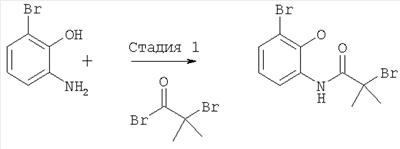 В раствор 2-амино-6-бромфенола (4,198 г, 22,3 ммоля) в сухом СН2Cl2 (200 мл) добавляли пиридин (1,8 мл, 22,3 ммоля), смесь охлаждали на ледяной бане и медленно добавляли раствор 2-бром-2-метилпропионилбромида (2,8 мл, 22,6 ммоля). Смесь перемешивали при комнатной температуре в течение 1 ч, а затем выливали в СН2Cl2 и воду. Органический слой промывали водой, сушили и концентрировали в вакууме, при этом получали неочищенный 2-бром-N-(3-бром-2-гидроксифенил)-2-метилпропионамид, который использовали на стадии 2 без дополнительной очистки.