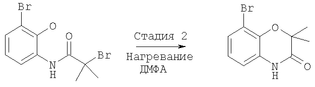 2-Бром-N-(3-бром-2-гидроксифенил)-2-метилпропионамид, полученный на стадии 1, растворяли в ДМФА (200 мл) и в полученный раствор добавляли К2СО3 (6,3 г, 45,58 ммоля). Смесь нагревали при 150°С в течение ночи, затем охлаждали и выливали в смесь вода/этилацетат. Органический слой промывали солевым раствором, сушили над MgSO4 и концентрировали в вакууме. Полученный остаток коричневого цвета очищали экснресс-хроматографией, при этом получали 8-бром-2,2-диметил-4Н-бензо[1,4]оксазин-3-он в виде твердого вещества белого цвета (84,6%). МС: 256 (М-Н)–.
