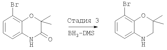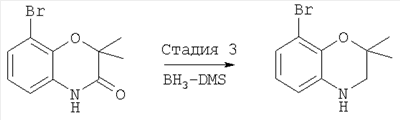 8-Бром-2,2-диметил-4Н-бензо[1,4]оксазин-3-он, полученный на стадии 2 (768,30 мг, 3,0 ммоля), растворяли в сухом тетрагидрофуране (ТГФ) и раствор нагревали до температуры кипения растворителя. В реакционную смесь добавляли по каплям 0,3 мл 10 М раствора борана/диметилсульфида (ВН3/ДМС) в ТГФ и смесь кипятили с обратным холодильником в течение 1 ч. Затем в реакционную смесь добавляли по каплям 10% раствор HCl в этаноле до появления белого осадка и смесь кипятили с обратным холодильником в течение 10 мин. Реакционную смесь охлаждали, осадок отделяли фильтрованием, промывали эфиром и высушивали на воздухе, при этом получали 770 мг гидрохлорида 8-бром-2,2-диметил-3,4-дигидро-2Н-бензо[1,4]оксазина (92%) в виде твердого вещества белого цвета. МС: 280 (М+Н).