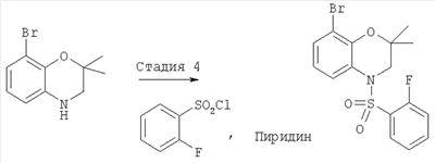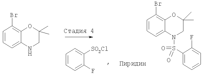 Гидрохлорид 8-бром-2,2-диметил-3,4-дигидро-2Н-бензо[1,4]оксазина (518 мг, 2,14 ммоля) растворяли в 5 мл хлористого метилена и в полученный раствор добавляли пиридин (253,85 г, 3,21 ммоля). Реакционную смесь перемешивали при комнатной температуре, добавляли по каплям 2-фторбензолсульфонилхлорид (416,37 мг, 2,14 ммоля) и смесь перемешивали при комнатной температуре в течение еще 2 ч. Затем реакционную смесь кипятили с обратным холодильником в течение 1 ч, охлаждали до комнатной температуры, разбавляли добавлением 5 мл хлористого метилена и добавляли 10% HCl. Органический слой отделяли, промывали водой, насыщенным раствором NaHCO3 и сушили (Na2SO4). Растворитель удаляли при пониженном давлении, остаток очищали экспресс-хроматографией (элюент: EtOAc/гексан, от 5% до 20%), при этом получали 610 мг (71,3%) 8-бром-4-(2-фторбензолсульфонил)-2,2-диметил-3,4-дигидро-2Н-бензо[1,4]оксазина в виде масла, которое затвердевало при хранении. tпл.108,0-110,1°C. МС: 401 (М+Н).