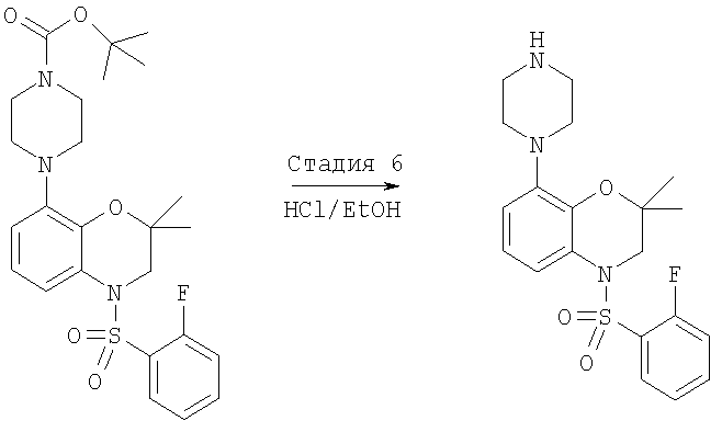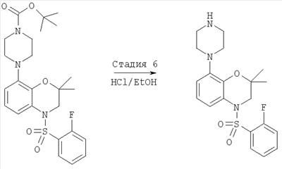 трет-Бутиловый эфир 4-[4-(2-фторбензолсульфонил)-2,2-диметил-3,4-дигидро-2Н-бензо[1,4]оксазин-8-ил]пиперазин-1-карбоновой кислоты (470 мг, 0,93 ммоля) растворяли в 3 мл этанола, в полученный раствор добавляли 1 мл 10% раствора HCl в этаноле, смесь нагревали при 100°С (на паровой бане) в течение 15 мин и охлаждали до комнатной температуры, при этом наблюдалось образование осадка в виде кристаллического вещества белого цвета. Твердое вещество отделяли фильтрованием и сушили при 70°С в вакууме, при этом получали 160 мг гидрохлорида 4-(2-фторбензолсульфонил)-2,2-диметил-8-пиперазин-1-ил-3,4-дигидро-2Н-бензо[1,4]оксазина. tпл.222,9-227,1°С. МС: 479 (М+Н).