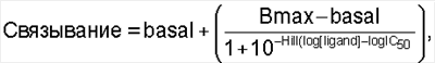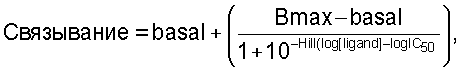 где Hill означает коэффициент наклона по Хиллу, [лиганд] означает концентрацию конкурирующего радиактивного меченого лиганда, a IC50 означает концентрацию радиоактивного меченого лиганда, при которой наблюдается специфическое связывание, равное половине от максимального значения. В числителе указано специфическое связывание, которое означает разность между Bmax и базисными данными (basal).