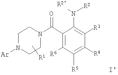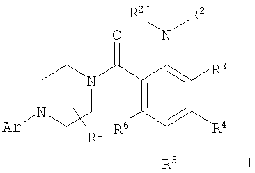 где Ar представляет собой замещенный фенил или 6-членный гетероарил, содержащий один, два или три атома азота, где фенильная и гетероарильные группы являются замещенными одним-тремя заместителями, выбранными из группы, состоящей из галогена, NO2, CN, (С1-С6)-алкила, (С1-С6)-алкила, замещенного галогеном, (С1-С6)-алкокси, (С1-С6)-алкокси, замещенного галогеном, NR7R8, C(O)R9 или SO2R10; R1 представляет собой водород или (С1-С6)-алкил; R2 и R2′ независимо друг от друга представляют собой водород, (CR2)n-гидрокси, в том случае, когда R означает водород или (С1-С6)-алкил, или представляют собой (С1-С6)-алкил, (С2-С6)-алкенил, (СН2)n-(С3-С6)-циклоалкил, (СН2)n-гетероциклоалкил, где гетероциклоалкил выбран из тетрагидрофуранила, тетрагидропиранила, (СН2)n-O-(С1-С6)-алкил или (СН2)n-фенил, или R2 и R2′ образуют вместе с атомом азота, к которому они присоединены, 4-7-членное гетероциклоалкильное кольцо, необязательно содержащее в дополнение к атому N еще один гетероатом, выбранный из группы, состоящей из N, S или О, где указанные кольца являются незамещенными или замещенными группой (CH2)n-гидрокси, (C1-С6)-алкилом, группой (С1-С6)-алкокси, (СН2)n-O-(С1-С6)-алкилом, или образуют вместе с атомом азота 5-членную гетероарильную группу, необязательно содержащую в дополнение к атому N один, два или три дополнительных атома азота и где гетероарильная группа является необязательно замещенной (С1-С6)-алкилом; R3, R4 и R6 независимо друг от друга представляют собой водород, галоген; R5 представляет собой NO2, CN, C(O)R9, S-(С1-С6)-алкил, SO2R10 или представляет собой NR11R12; R7 и R8 независимо друг от друга представляют собой водород, (СН2)n-(С3-С6)-циклоалкил или (С1-С6)-алкил, или образуют вместе с атомом азота, к которому они присоединены, 5-6-членное гетероциклоалкильное кольцо, необязательно содержащее в дополнение к атому N еще один гетероатом О; R9 представляет собой (С1-С6)-алкил, (С1-С6)-алкокси или NR7R8; R10 представляет собой (С1-С6)-алкил, (СН2)n-(С3-С6)-циклоалкил или NR7R8; R11 и R12 независимо друг от друга представляют собой водород, SO2-(С1-С6)-алкил, или образуют вместе с атомом азота 5-членную гетероарильную группу, необязательно содержащую в дополнение к атому N один или три атома азота, и где гетероарильная группа является необязательно замещенной (СН2)n(С3-С6)-циклоалкилом; n означает 0, 1 или 2; и фармацевтически приемлемые кислотно-аддитивные соли этого соединения, при условии, что исключаются следующие соединения: 1-(4-метоксифенил)-4-[2-(4-метил-1-пиперазинил)-5-нитробензоил]пиперазин, 1-(4-метоксифенил)-4-[2-(4-морфолинил)-5-нитробензоил]пиперазин, 1-[2-(4-морфолинил)-5-нитробензоил]-4-[2-нитро-4-(трифторметил)фенил]пиперазин, 1-(4-метоксифенил)-4-[5-нитро-2-(1-пирролидинил)бензоил]пиперазин, 1-[2-[4-(2-гидроксиэтил)-1-пиперазинил]-5-нитробензоил]-4-(4-метоксифенил)пиперазин, 1-[2-фтор-4-(1-оксопропил)фенил]-4-[5-нитро-2-(1-пиперидинил)-бензоил]пиперазин, 1-[2-фтор-4-(1-оксопропил)фенил]-4-[5-нитро-2-(1-пирролидинил)-бензоил]пиперазин, 1-[2-фтор-4-(1-оксопропил)фенил]-4-[2-(4-метил-1-пиперидинил)-5-нитробензоил]пиперазин, 1-[2-фтор-4-(1-оксопропил)фенил]-4-[2-(4-метил-1-пиперазинил)-5-нитробензоил]пиперазин, 1-[2-фтор-4-(1-оксопропил)фенил]-4-[2-(4-морфолинил)-5-нитробензоил]пиперазин, 1-[5-[[метил(фенилметил)амино]сульфонил]-2-(4-морфолинил)бензоил]-4-(4-нитрофенил)пиперазин и 1-(4-ацетил-2-фторфенил)-4-[2-(4-морфолинил)-5-нитробензоил]-пиперазин, 1-{4-[4-(2-морфолин-4-ил-5-нитробензоил)пиперазин-1-ил]-3-фторфенил}этанон.
