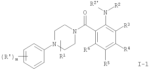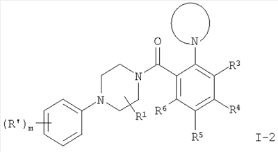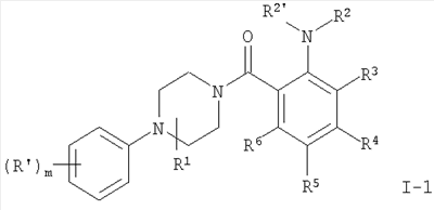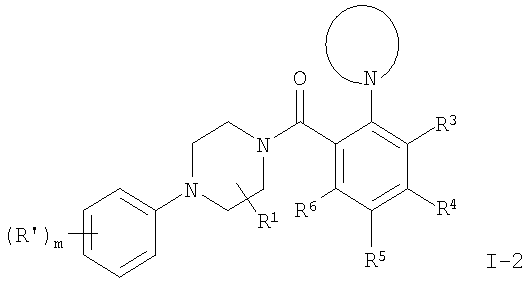 6. Соединение формулы 1-2 по п.5, которое представляет собой одно из следующих соединений: 1-{3-фтор-4-[4-(5-нитро-2-пирролидин-1-илбензоил)пиперазин-1-ил]фенил}этанон, 1-{3-фтор-4-[4-(5-нитро-2-пиперидин-1-илбензоил)пиперазин-1-ил]фенил}этанон, 1-{4-[4-(2-азепан-1-ил-5-нитробензоил)пиперазин-1-ил]-3-фторфенил}этанон, 1-(3-фтор-4-{4-[2-(2-метилпиперидин-1-ил)-5-нитробензоил]пиперазин-1-ил}фенил)этанон, 1-(3-фтор-4-{4-[2-(4-метилпиперидин-1-ил)-5-нитробензоил]пиперазин-1-ил}фенил)этанон, 1-(3-фтор-4-{4-[2-(3-метилпиперидин-1-ил)-5-нитробензоил]пиперазин-1-ил}фенил)этанон, 1-(3-фтор-4-{4-[2-(2-метилпирролидин-1-ил)-5-нитробензоил]пиперазин-1-ил}фенил)этанон, 1-(4-{4-[2-(2,5-дигидропиррол-1-ил)-5-нитробензоил] пиперазин-1-ил}-3-фторфенил)этанон, 1-{3-фтор-4-[4-(5-нитро-2-тиоморфолин-4-илбензоил)пиперазин-1-ил]фенил}этанон, 1-(3-фтор-4-{4-[2-(3-гидроксипиперидин-1-ил)-5-нитробензоил]пиперазин-1-ил}фенил)этанон, 1-{4-[4-(2-азепан-1-ил-5-метансульфонилбензоил)пиперазин-1-ил]-3-фторфенил}этанон, 1-{3-фтор-4-[4-(5-метансульфонил-2-пирролидин-1-илбензоил)пиперазин-1-ил]фенил}этанон, N-метил-4-пирролидин-1-ил-3-[4-(4-трифторметилфенил)пиперазин-1-карбонил]бензолсульфонамид, N-метил-4-морфолин-4-ил-3-[4-(4-трифторметилфенил)пиперазин-1-карбонил]бензолсульфонамид, 3-[4-(4-ацетил-2-фторфенил)пиперазин-1-карбонил]-N-метил-4-пирролидин-1-илбензолсульфонамид, 1-(3-фтор-4-{4-[2-(3-гидроксиметилпирролидин-1-ил)-5-нитробензоил]пиперазин-1-ил}фенил)этанон, 2-[4-(2-морфолин-4-ил-5-нитробензоил)пиперазин-1-ил]-5-трифторметилбензонитрил, 3-фтор-4-[4-(5-метансульфонил-2-пиперидин-1-илбензоил)пиперазин-1-ил]бензонитрил, 2-фтор-4-[4-(5-метансульфонил-2-пиперидин-1-илбензоил)пиперазин-1-ил]бензонитрил, [4-(2-фтор-4-трифторметилфенил)пиперазин-1-ил]-(5-метансульфонил-2-пиперидин-1-илфенил)метанон, [4-(3-фтор-4-трифторметилфенил)пиперазин-1-ил]-(5-метансульфонил-2-пиперидин-1-илфенил)метанон, 3-[4-(4-циано-фенил)пиперазин-1-карбонил]-N-метил-4-пирролидин-1-илбензолсульфонамид, 3-[4-(4-циано-2-фторфенил)пиперазин-1-карбонил]-N-метил-4-пирролидин-1-илбензолсульфонамид, 3-[4-(2-фтор-4-трифторметилфенил)пиперазин-1-карбонил]-N-метил-4-пирролидин-1-илбензолсульфонамид, 3-[4-(3-фтор-4-трифторметилфенил)пиперазин-1-карбонил]-N-метил-4-пирролидин-1-илбензолсульфонамид, 3-[4-(4-ацетил-2-фторфенил)пиперазин-1-карбонил]-N-метил-4-пиперидин-1-илбензолсульфонамид, 3-[4-(4-циано-фенил)пиперазин-1-карбонил]-N-метил-4-пиперидин-1-илбензолсульфонамид, 3-[4-(4-циано-2-фторфенил)пиперазин-1-карбонил]-N-метил-4-пиперидин-1-илбензолсульфонамид, 3-[4-(4-циано-3-фторфенил)пиперазин-1-карбонил]-N-метил-4-пиперидин-1-илбензолсульфонамид, N-метил-4-пиперидин-1-ил-3-[4-(4-трифторметилфенил)пиперазин-1-карбонил]бензолсульфонамид, 3-[4-(2-фтор-4-трифторметилфенил)пиперазин-1-карбонил]-N-метил-4-пиперидин-1-илбензолсульфонамид, 3-[4-(2-фтор-4-трифторметилфенил)пиперазин-1-карбонил]-N-метил-4-пиперидин-1-илбензолсульфонамид, 3-[4-(2-фтор-4-трифторметилфенил)пиперазин-1-карбонил]-N-метил-4-морфолин-4-илбензолсульфонамид или 3-[4-(3-фтор-4-трифторметилфенил)пиперазин-1-карбонил]-N-метил-4-морфолин-4-илбензолсульфонамид.