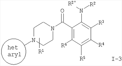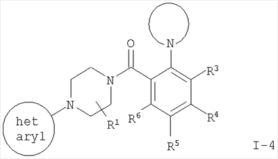 9. Соединение формулы I-4 по п.8, которое представляет собой одно из следующих соединений: 3-[4-(3-фтор-4-трифторметилфенил)пиперазин-1-карбонил]-N-метил-4-морфолин-4-илбензолсульфонамид, (2-морфолин-4-ил-5-нитрофенил)-[4-(5-трифторметилпиридин-2-ил)пиперазин-1-ил]метанон, [4-(3-хлор-5-трифторметилпиридин-2-ил)пиперазин-1-ил]-(2-морфолин-4-ил-5-нитрофенил)метанон, 6-[4-(2-морфолин-4-ил-5-нитробензоил)пиперазин-1-ил]никотинонитрил, [4-(3-хлор-пиридин-2-ил)пиперазин-1-ил]-(2-морфолин-4-ил-5-нитрофенил)метанон, (2-морфолин-4-ил-5-нитрофенил)-[4-(4-трифторметилпиридин-2-ил)пиперазин-1-ил]метанон, (2-морфолин-4-ил-5-нитрофенил)-[4-(6-трифторметилпиридин-2-ил)пиперазин-1-ил]метанон, [4-(5-бром-пиримидин-2-ил)пиперазин-1-ил]-(2-морфолин-4-ил-5-нитрофенил)метанон, [4-(6-хлор-5-трифторметилпиридин-2-ил)пиперазин-1-ил]-(2-морфолин-4-ил-5-нитрофенил)метанон, (5-метансульфонил-2-морфолин-4-илфенил)-[4-(2-трифторметилпиримидин-4-ил)пиперазин-1-ил]метанон, (5-метансульфонил-2-морфолин-4-илфенил)-[4-(6-трифторметилпиримидин-4-ил)пиперазин-1-ил]метанон, (5-метансульфонил-2-морфолин-4-илфенил)-[4-(5-трифторметилпиримидин-2-ил)пиперазин-1-ил]метанон, 6-[4-(5-метансульфонил-2-морфолин-4-илбензоил)пиперазин-1-ил]никотинонитрил, (5-метансульфонил-2-морфолин-4-илфенил)-[4-(5-трифторметилпиридин-2-ил)пиперазин-1-ил]метанон, [4-(3-хлор-5-трифторметилпиридин-2-ил)пиперазин-1-ил]-(5-метансульфонил-2-морфолин-4-илфенил)метанон, [4-(5-хлор-пиридин-2-ил)пиперазин-1-ил]-(5-метансульфонил-2-морфолин-4-илфенил)метанон, (5-метансульфонил-2-морфолин-4-илфенил)-[4-(6-трифторметилпиридин-3-ил)пиперазин-1-ил]метанон, [4-(3-фтор-5-трифторметилпиридин-2-ил)пиперазин-1-ил]-(5-метансульфонил-2-морфолин-4-илфенил)метанон, (5-метансульфонил-2-морфолин-4-илфенил)-[4-(6-метилпиридин-3-ил)-пиперазин-1-ил]метанон, (5-метансульфонил-2-морфолин-4-илфенил)-[4-(5-метилпиридин-2-ил)-пиперазин-1-ил]метанон, (5-метансульфонил-2-морфолин-4-илфенил)-[4-(4-трифторметилпиридин-2-ил)пиперазин-1-ил]метанон, (5-метансульфонил-2-морфолин-4-илфенил)-[4-(6-трифторметилпиридин-2-ил)пиперазин-1-ил]метанон, (5-метансульфонил-2-морфолин-4-илфенил)-[4-(2-трифторметил-пиримидин-5-ил)пиперазин-1-ил]метанон, (5-метансульфонил-2-морфолин-4-илфенил)-[4-(6-трифторметил-пиридазин-3-ил)пиперазин-1-ил]метанон, [4-(4-диметиламино-[1,3,5]триазин-2-ил)пиперазин-1-ил]-(5-метансульфонил-2-морфолин-4-илфенил)метанон или, (5-метансульфонил-2-морфолин-4-илфенил)-(5′-трифторметил-2,3,5,6-тетрагидро-[1,2′]бипиразинил-4-ил)метанон.
