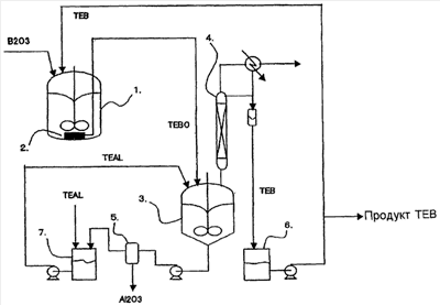 В резервуар 1 поместили 25,6 кг (0,368 кмоль) оксида бора и 36,1 кг (0,368 кмоль) ТЕВ, реакцию между которыми осуществляли в атмосфере азота при температуре реакции 210°С и давлении 1,7 МПа в течение 24 часов. В резервуар 3 поместили 154 кг (1,5 кмоль) TEAL; 55,5 кг фильтрата ТЕВО и 2,32 кг ТЕВ, полученных при отделении непрореагировавшего оксида бора на фильтре 2, подавали в резервуар 3 на протяжении 4 часов, в течение которых температуру раствора поддерживали равной 70°С. Затем температуру раствора увеличили с целью осуществления перегонки ТЕВ, которая началась, когда температура превысила 100°С. После этого, при регулировании флегмового числа в диапазоне от 5 до 10, в сборнике 6 было получено 99,5 кг (1,02 кмоля) дистиллята, представляющего собой ТЕВ. 2,56 кг (0,037 кмоля) непрореагировавшего оксида бора, отделенного фильтрацией от кубового остатка, и дополнительно 23,1 кг (0,33 кмоля) оксида бора объединили в резервуаре 1, затем также поместили в него 35,9 кг (0,366 кмоля) полученного ТЕВ и осуществили описанную выше реакцию с получением 55,5 кг ТЕВ. После перегонки кубовый остаток в резервуаре 3 состоял из 33,7 кг (0,33 кмоля) оксида алюминия, 78,6 кг (0,688 кмоля) TEAL, 1,01 кг (0,01 кмоля) ТЕВ и 1,13 кг (0,007 кмоля) ТЕВО; оксид алюминия отделили на фильтровальной установке 5. Фильтрат снова подали в резервуар 3 и дополнительно ввели столько TEAL, что общее количество TEAL составило 154 кг (1,5 кмоля). Затем раствор, полученный после прохождения через фильтр 2, также подали в резервуар 3 и осуществили реакцию синтеза ТЕВ и перегонку так же, как и ранее. Этот цикл повторили 5 раз. В результате был получен стабильный высококачественный продукт – ТЕВ – в количестве от 63 до 64 кг, выход которого, рассчитанный на основе расходования TEAL как сырьевого материала, поддерживали равным приблизительно 96%.