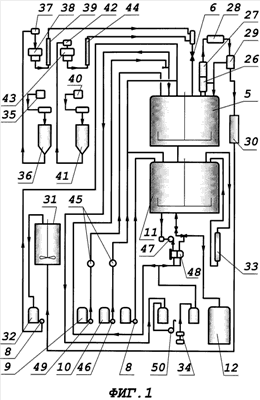 Система азеотропного водоотделения и регенерации промежуточных продуктов включает смонтированные на верхней части реактора 5 насадочную колонну 26 и холодильник 27, гидравлически сообщенные с ними технологическими трубопроводами 7 внешний теплообменник 28 и разделительный сосуд 29 типа флорентина, последовательно сообщенные технологическими трубопроводами 7 с разделительным сосудом 29 сборник 30 смеси воды с растворителем, например ксилолом, реактор 31 регенерации растворителя и сборник 32 регенерированного растворителя. Разделительный сосуд 29 гидравлически закольцован с насадочной колонной 26 и реактором 5 через вентили запорной арматуры, установленные предпочтительно на каждом из вводов в насадочную колонную 26 и в реактор 5. Реактор 5, в свою очередь, через насосное оборудование 8 гидравлически сообщен со сборником 32 регенерированного растворителя.