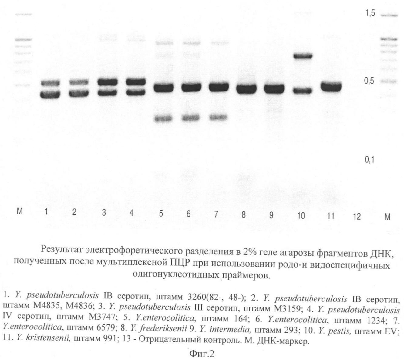Задачей настоящего изобретения является разработка набора родо- и видоспецифичных олигонуклеотидных праймеров для детекции бактерий рода Yersinia и идентификации патогенных для человека видов: Y.pestis, Y.pseudotuberculosis и Y.Enterocolitica методом мультиплексной полимеразной цепной.