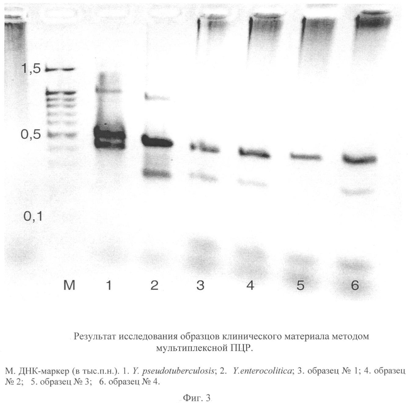 Суть изобретения заключается в создании олигонуклеотидных праймеров для одностадийной экспресс-диагностики иерсиний с помощью мультиплексного ПЦР-анализа. Настоящее изобретение позволяет усовершенствовать технику ПЦР-анализа иерсиний для рутинного использования в диагностике иерсиниозных инфекций, так как нет необходимости прибегать к использованию дополнительных методов анализа (рестрикционный анализ, гибридизация со специфическими зондами), тем самым сокращается продолжительность выполнения анализа и снижается его себестоимость и трудоемкость.