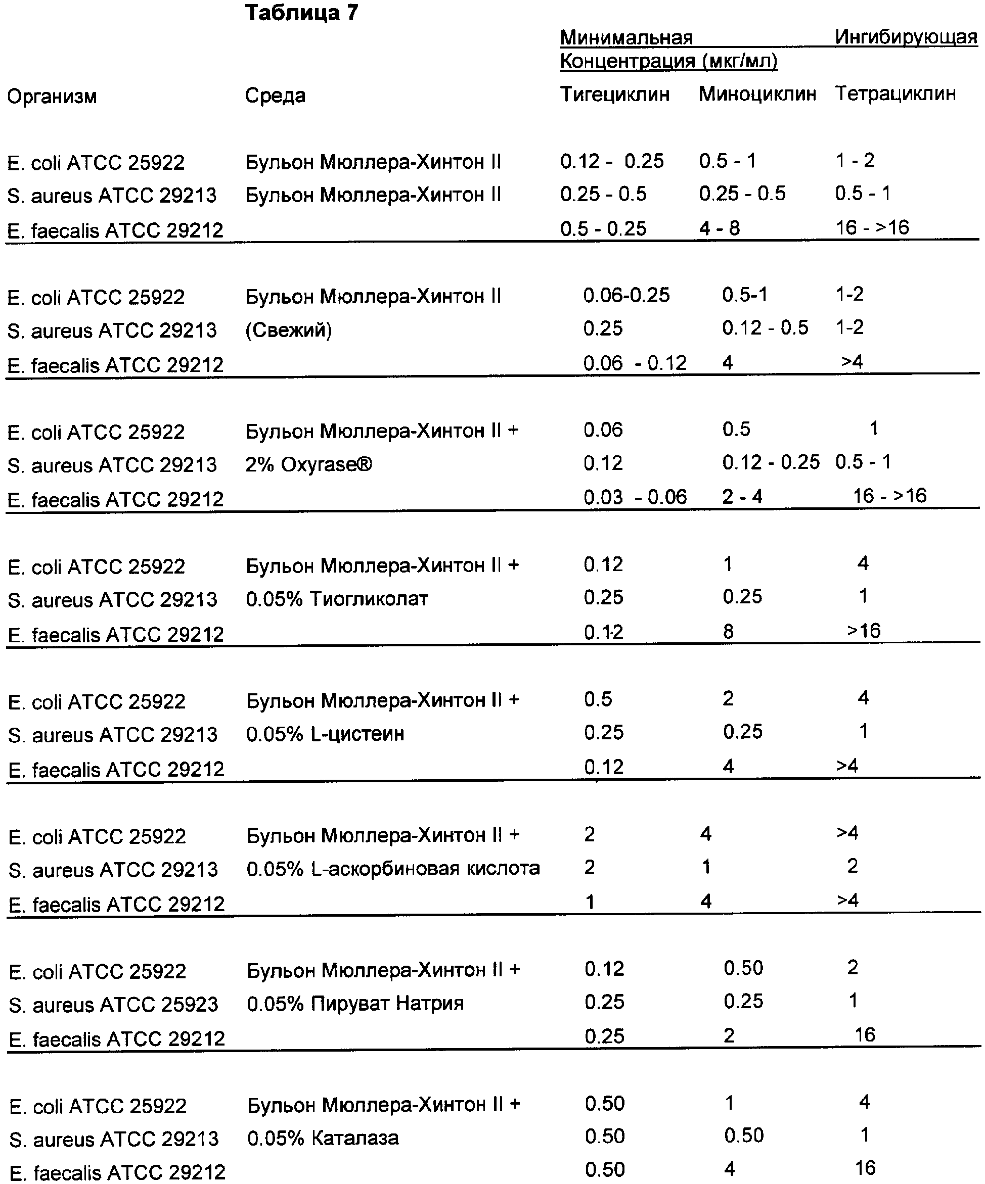 Для того чтобы определить, можно ли контролировать концентрацию растворенного кислорода в среде на основе бульона путем добавления восстанавливающих кислород веществ в среду, определяли значения МИК в присутствии 0.05% (мас./об.) L-цистеина, 0.05% L-аскорбиновой кислоты, 0.05% пирувата натрия, 0.05% каталазы и 0.05% тиогликолата натрия, о каждом из которых ранее сообщалось, что в питательной среде для патогенных бактерий они действуют как восстанавливающие кислород препараты. Влияние восстанавливающих препаратов на активность тигециклина, миноциклина и тетрациклина in vitro показано в Таблице 7.