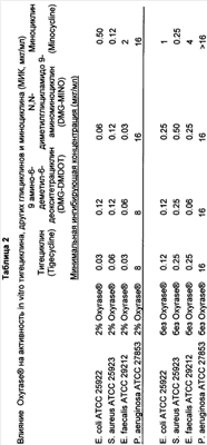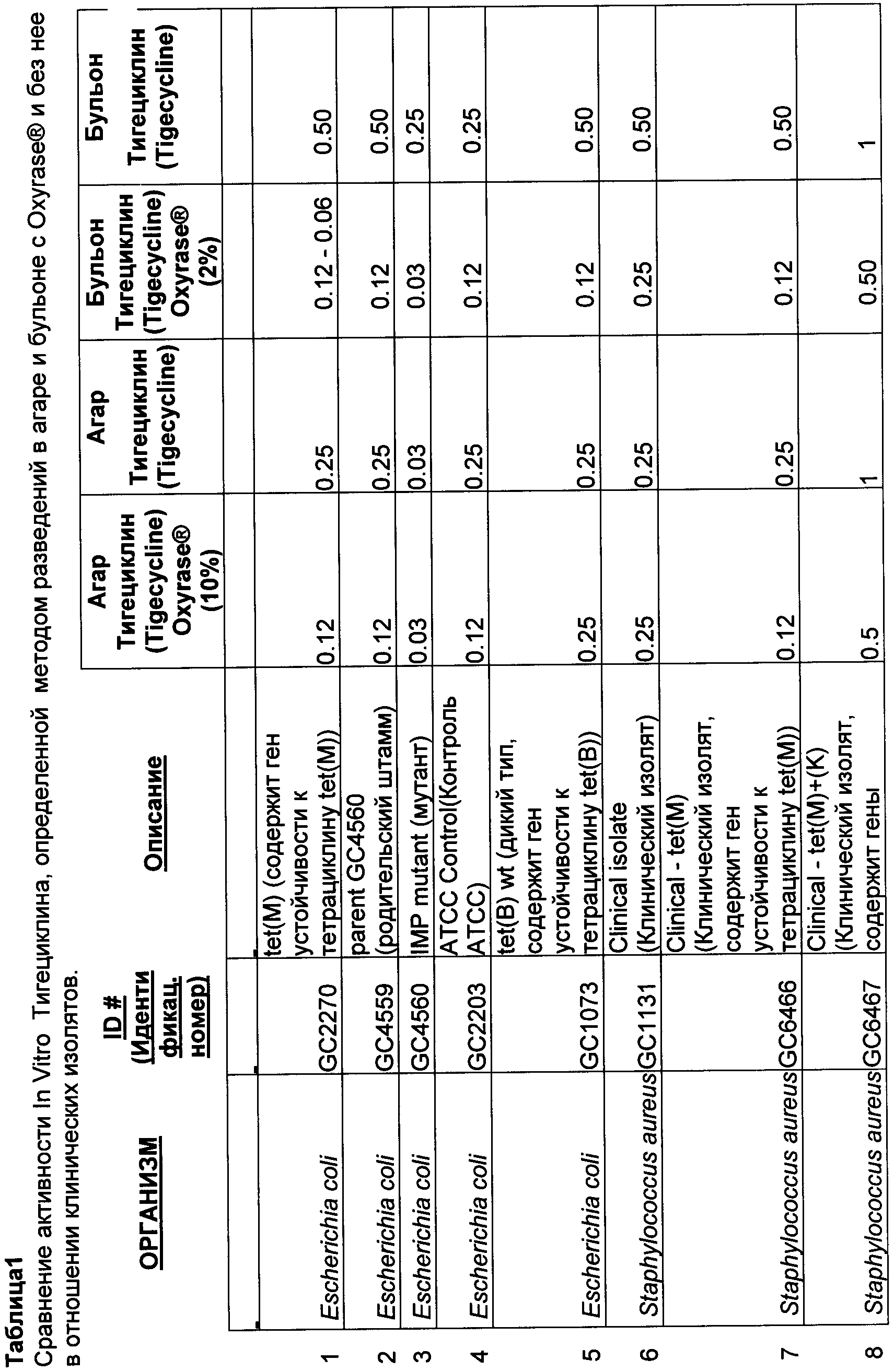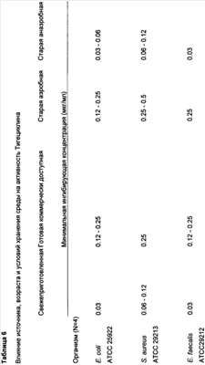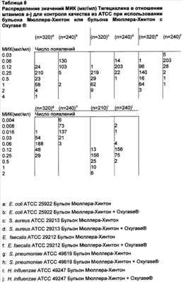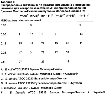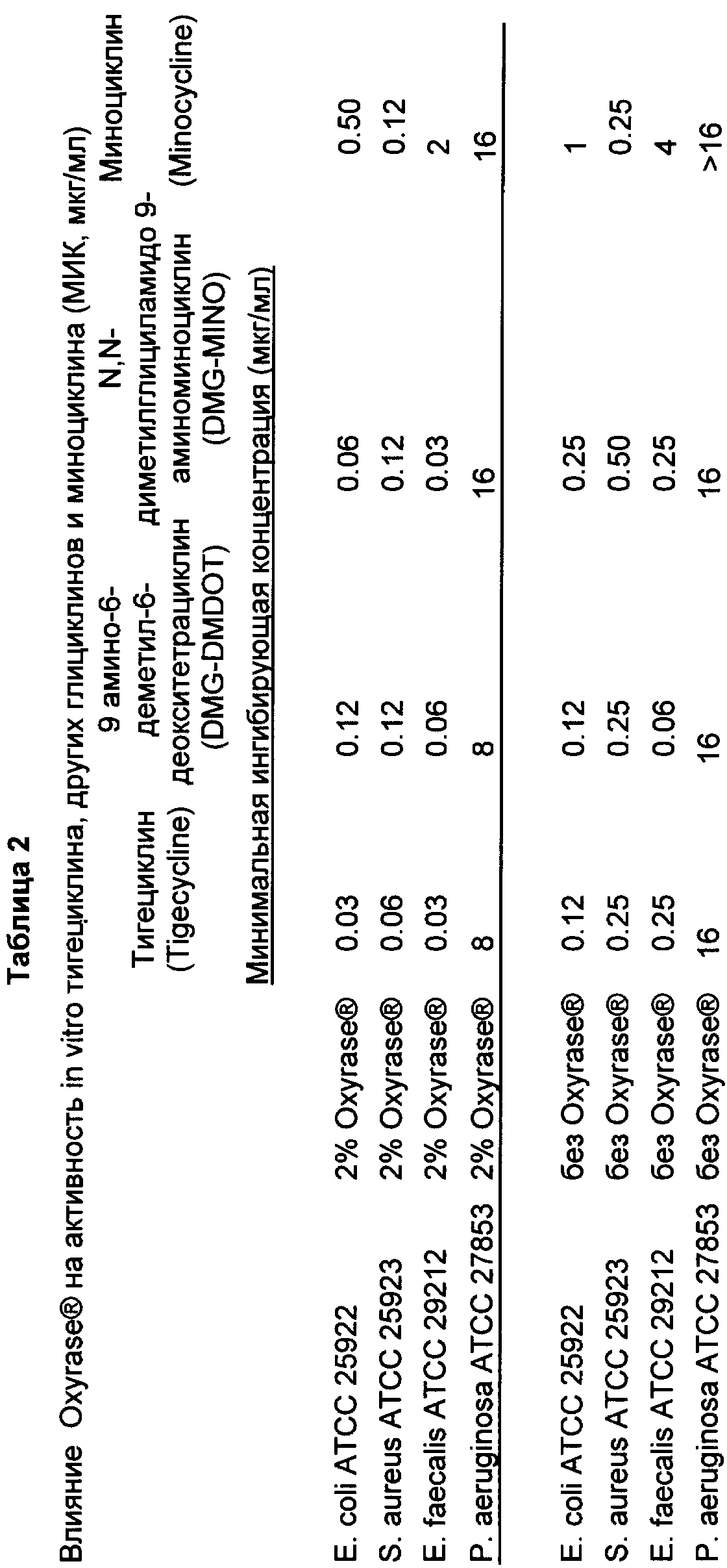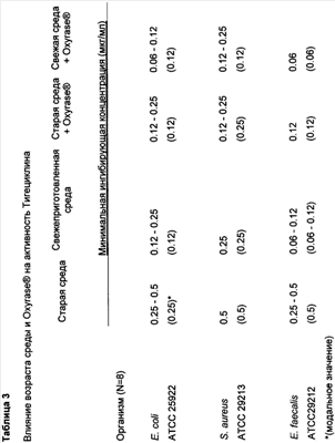 Эффект Oxyrase® на активность тигециклина, других глициклинов и миноциклина in vitro (МИК, мкг/мл) показан в Таблице 2.