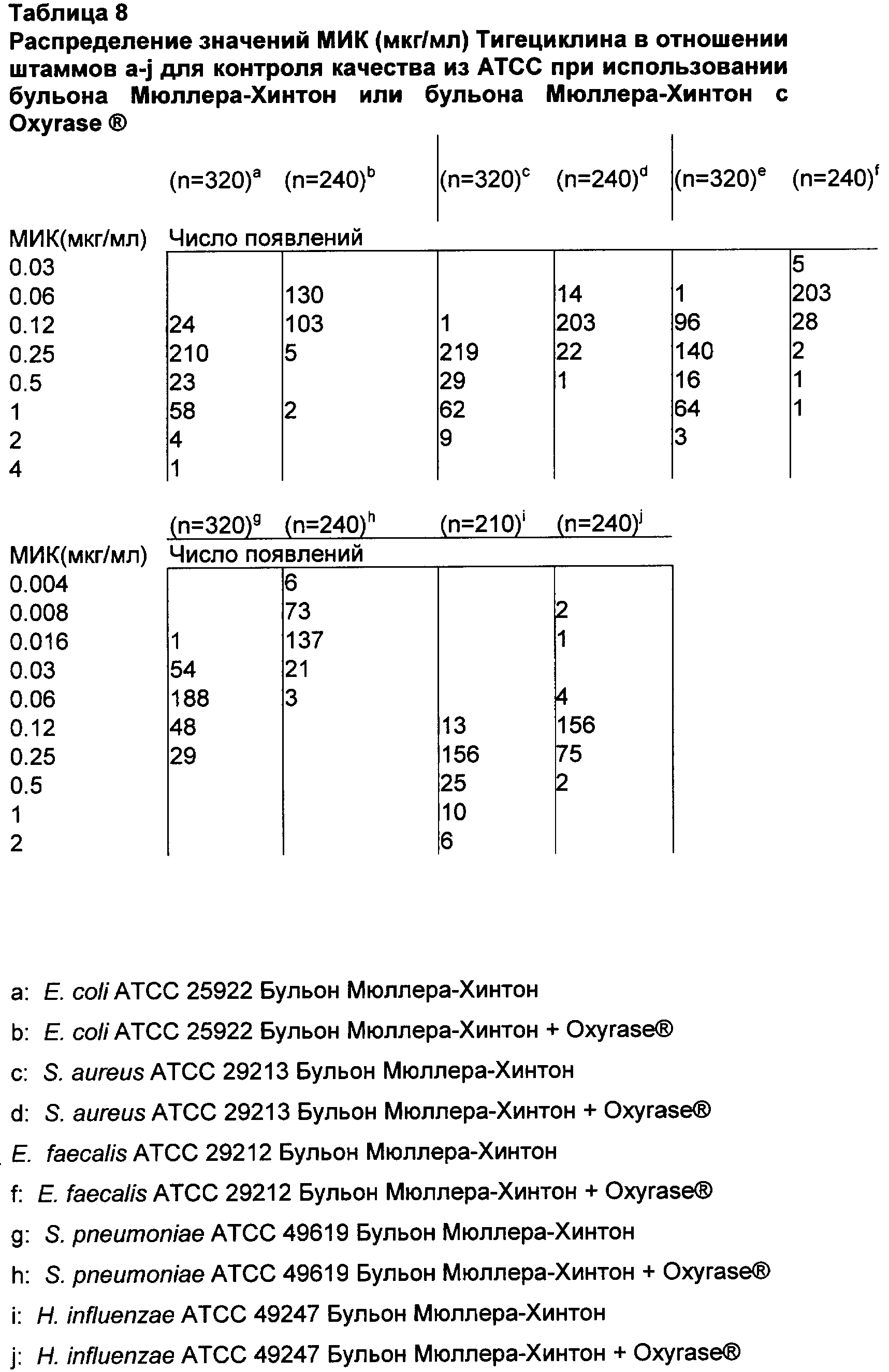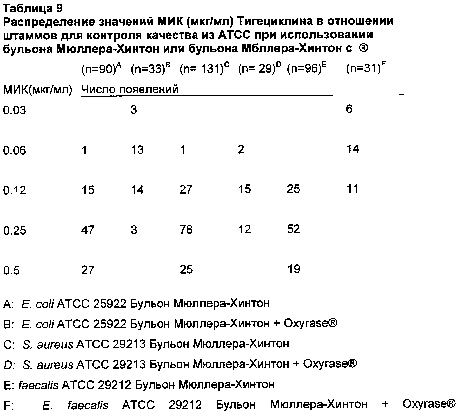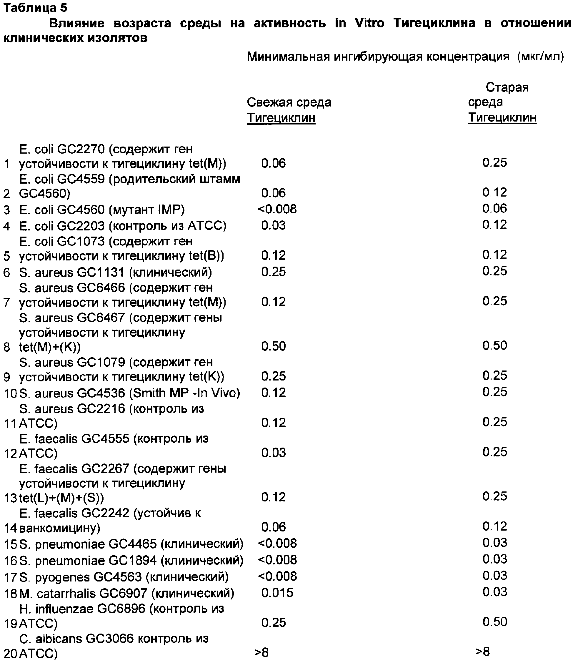 Активность in vitro тигециклина и контрольных антибиотиков определяли методом микроразведений в бульоне, выполняемым согласно рекомендациям NCCLS. (National Committee for Clinical Laboratory Standards, 2003. Национальный Комитет по клиническим лабораторным стандартам США (NCCLS), 2003. Methods for Dilution Antimicrobial Susceptibility Tests for Bacteria That Grow Aerobically (Методы разведении для анализа антимикробной чувствительности бактерий, растущих в аэробных условиях); Утвержденные стандарты: М7-А6, 6-е издание, том 23. Национальный Комитет по клиническим и лабораторным стандартам США (NCCLS, Уэйн, Пенсильвания) применяли для стандартных процедур. Для анализа S. pneumoniae применяли бульон Мюллера-Хинтон с 5% лизированной крови лошади, а для анализа Н. influenzae применяли Haemophilus Test Medium (среда для тестирования гемофил). Oxyrase® (Oxyrase Inc, Mansfield, ОН) применяли, следуя инструкциям производителя: добавляли 1 мл Oxyrase® к 50 мл среды. Исследования влияния (эффекта) возраста среды проводили путем приготовления бульона Мюллера-Хинтон в наборе колб с последующим хранением среды в разных условиях. Определение МИК обычно проводили в дупликатах в каждый день анализа. Хранение в анаэробных условиях осуществляли в анаэробной камере (MACS MG 1000, Don Whitley Scientific LTD). pH среды измеряли при помощи рН-метра (Corning 430). Сравнение активности тигециклина in vitro в отношении клинических изолятов по методикам микроразведений в агаре и бульоне, с Oxyrase® и без нее показано в Таблице 1.