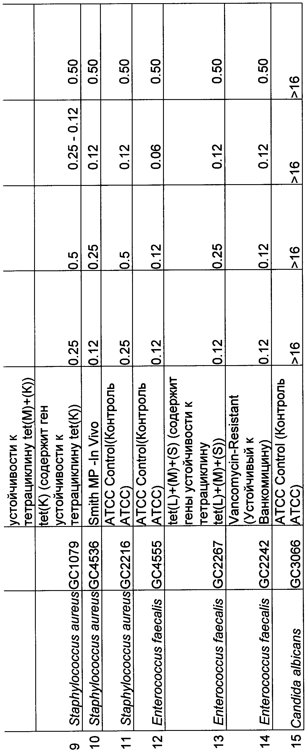Бактериальные изоляты представляли собой изоляты, рекомендованные NCCLS для контроля качества проб на чувствительность. (Национальный Комитет по клиническим лабораторным стандартам США (NCCLS), 2003. Methods for Dilution Antimicrobial Susceptibility Tests for Bacteria That Grow Aerobically (Методы разведении для анализа антимикробной чувствительности бактерий, растущих в аэробных условиях); Утвержденные стандарты: М7-А6, 6-е издание, том 23. Национальный Комитет по клиническим и лабораторным стандартам США (NCCLS, Уэйн, Пенсильвания), Национальный Комитет по клиническим и лабораторным стандартам США, 2003. Methods for Dilution Antimicrobial Disk Susceptibility Tests (Методы разведении для дисковых тестов на антимикробную чувствительность), Утвержденные стандарты: М2-А8, 8-е изд., том 20. Национальный Комитет по клиническим и лабораторным стандартам США (NCCLS, Уэйн, Пенсильвания)). Стандарты включали E.coli АТСС 25922, S. aureus АТСС 29213, Е.faecalis АТСС 29212, S. pneumoniae АТСС 49247 и Н. influenzae АТСС 49247. Клинические изоляты бактерий E.coli, S. aureus, Е. faecalis, S. pneumoniae, S. pyogenes, M. catarrhalis и Н. influenzae получали из Общей коллекции культур Wyeth (Wyeth General Culture Collection). Штаммы E.coli и S. aureus, экспрессирующие описанные детерминатны устойчивости к тетрациклинам, были описаны ранее (Petersen, P.J., N.V.Jacobus, W.J.Weiss, Р.Е.Sum, R.Т.Testa, Antimicrob. Agents Chemother. 43:738-744, 1999 (Химиотерапия антимикробными препаратами)).