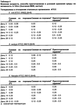 Влияние (эффект) возраста среды на значения МИК тигециклина. Для того, чтобы определить влияние возраста среды на активность тигециклина in vitro, готовили МНВ и хранили при комнатной температуре или 2°С в течение 28 дней. Планшеты с микроразведениями в бульоне тигециклина, миноциклина и тетрациклина готовили в дни 0, 7, 14, 21 и 28. Значения МИК определяли в 6-кратных повторах в каждый день анализа, как показано в Таблице 4. Кроме того, как показано в таблице 4, в течение 4-недельного периода анализа имело место воспроизводимое увеличение значений МИК тигециклина на 3-4 разведения. Старение среды несколько замедлялось при хранении среды при 4°С по сравнению со средой, которую хранили при комнатной температуре.