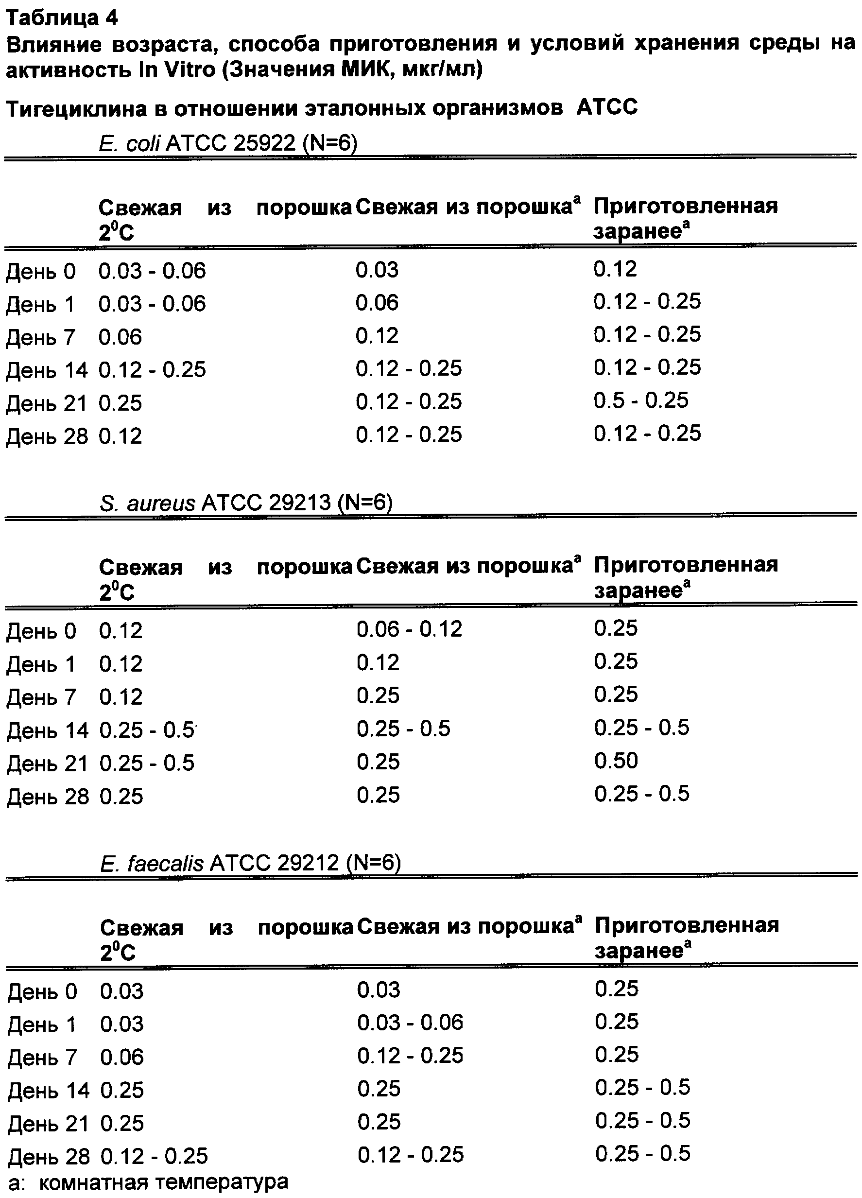 В Таблице 4 показано влияние возраста, способа приготовления и условий хранения среды на активность тигециклина in vitro (МИК, мкг/мл) тигециклина в отношении эталонных организмов АТСС 25922, АТСС 29213 и АТСС 29212 в течение временного интервала с дня 0 до дня 28.