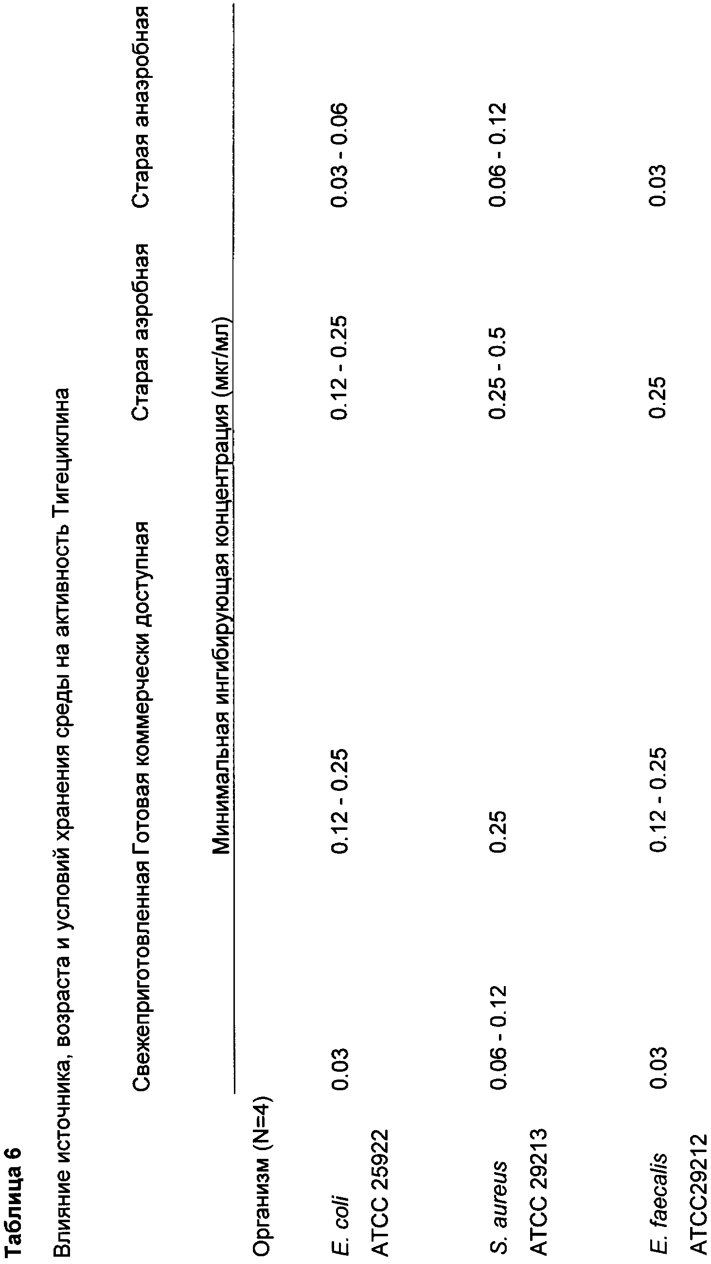 Поскольку рН среды со временем не изменялся, несоответствие значений МИК тигециклина, определенных в свежей среде, значениям, определенным в старой среде, нельзя объяснить этим фактором. Следовательно, хотя это не и подкрепляется теорией, постулируется, что несоответствие между свежей и старой средами может иметь причиной ускорение окислительной деструкции и формирование «раннего» пика, вызванные увеличением количества растворенного кислорода в среде на основе бульона, которое имеет место при хранении. Поскольку стало очевидным, что концентрация растворенного кислорода влияла на значения МИК тигециклина, было проведено исследование с целью оценить влияние старения среды, которую хранили в анаэробной камере. Как показано в Таблице 6, готовые коммерчески доступные среды, которые хранили в течение 2 недель при комнатной температуре в атмосферном воздухе, давали результаты определения МИК на 1-4 разведения превышающие результаты, полученные на свежеприготовленных средах. Напротив, среды, которые хранили в анаэробных условиях, давали результаты определения МИК тетрациклина, которые были практически идентичны результатам, полученным на свежих средах.