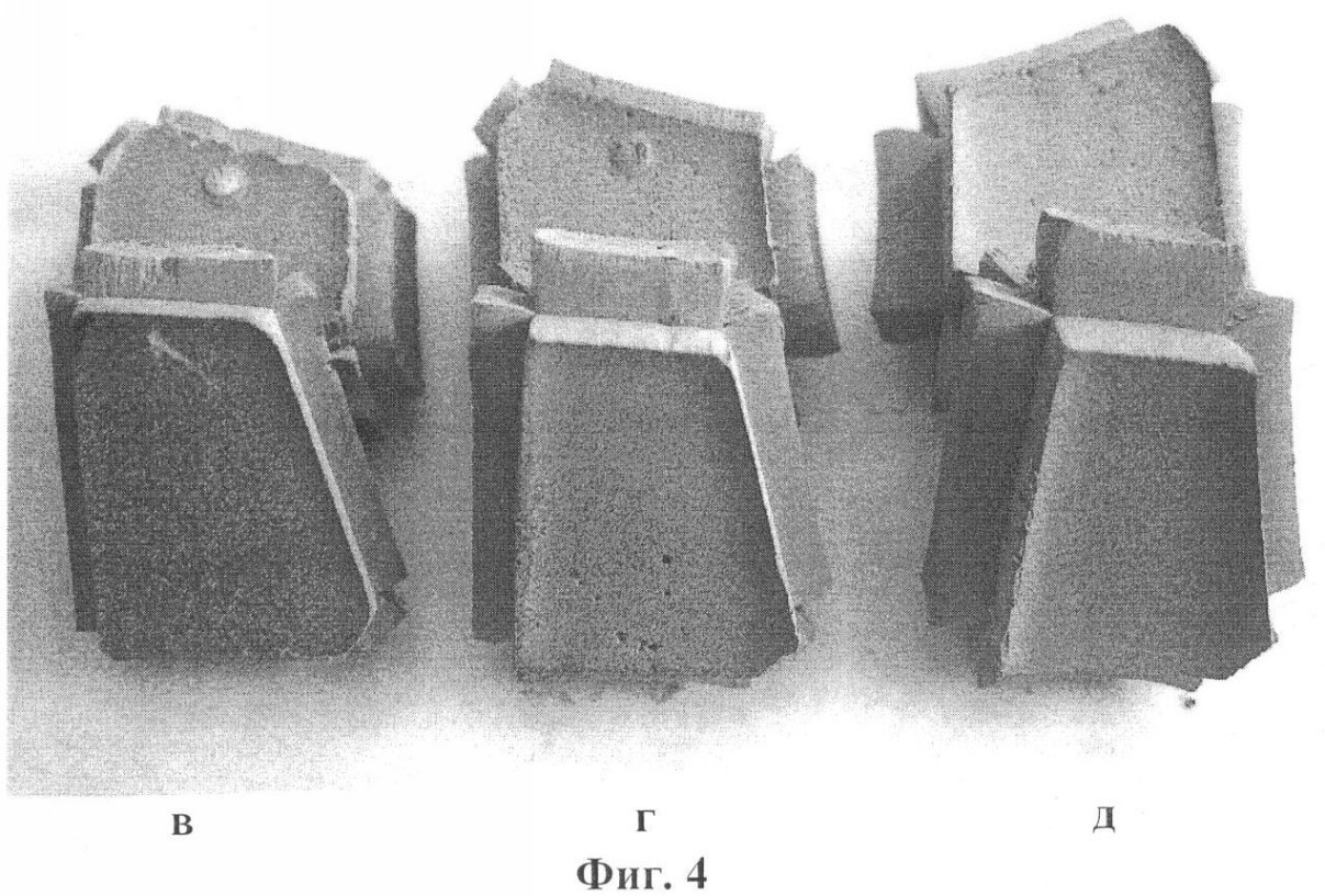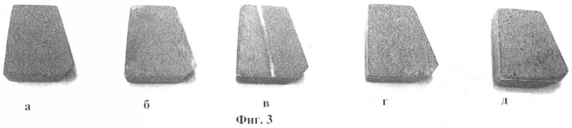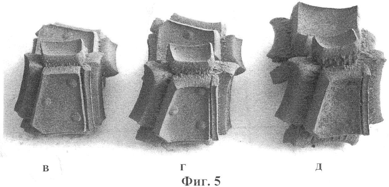 На фиг.5 показаны изделия газопоглотителя (ВК8), выдержанные в печи в воздушной атмосфере при 950°С в течение: в – 30 мин, г – 45 мин, д – 60 мин.