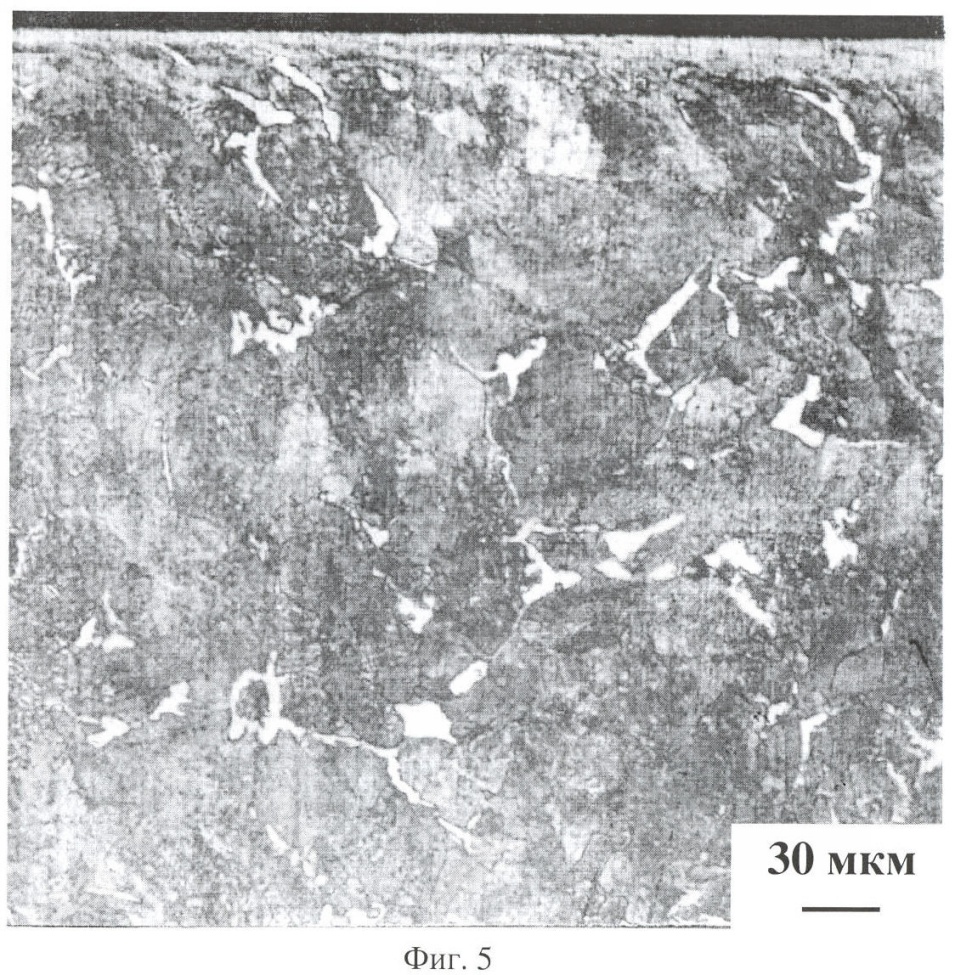 На металлографическом изображении структуры (фиг.5), в поверхностном слое толщиной 2-3 мкм наблюдается нетравящийся слой, а на глубине 3-12 мкм – неравноосные зерна, вытянутые в направлении обработки (фиг.7). Далее следует плавный переход к исходной структуре стали (фиг.8).