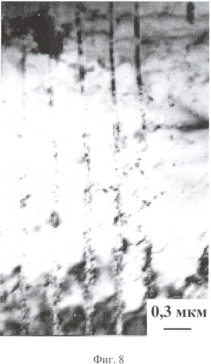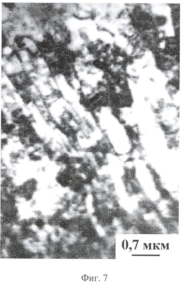 После обработки предлагаемым способом в поверхностном слое образца наблюдается нанокристаллическая структура, состоящая из смеси кристаллитов -фазы и хаотически расположенных частиц цементита (фиг.6). Области свободного феррита, характерные для структуры исходного состояния, практически не отмечаются. На глубине 3-10 мкм сохраняется зеренная, но продеформированная структура исходного материала и наблюдаются субструктурные превращения в пластинчатом перлите, такие как фрагментирование пластин феррита и пластин цементита (фиг.7). Области свободного феррита приобретают субзеренное строение.