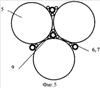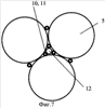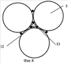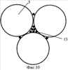 Для изготовления элементов с различной концентрацией абразивных зерен и с различными физико-механическими свойствами, кроме вышеуказанной смеси, могут быть приготовлены следующие смеси. Смесь может содержать абразивные порошки крупной зернистости 5, абразивные порошки первой мелкой зернистости 6 с покрытием 7 и абразивные порошки второй мелкой зернистости 9 без покрытия (фиг.5) либо абразивные порошки второй мелкой зернистости 10 с покрытием 11 (фиг.6). К абразивным порошкам крупной зернистости 5 в качестве порошков первой мелкой зернистости могут быть введены абразивные порошки 12 без покрытия и абразивные порошки второй мелкой зернистости 10 с покрытием 11 (фиг.7). Смесь может также содержать крупные абразивные порошки 5, абразивные порошки первой мелкой зернистости 12 без покрытия и порошки второй мелкой зернистости – металлические порошки 13 (фиг.8); порошки крупной зернистости 5, порошки первой мелкой зернистости 6 с покрытием 7 и порошки второй мелкой зернистости – металлические порошки 13 (фиг.9). Возможен вариант, в котором смесь составлена из крупных абразивных зерен 5 и металлических порошков 13 (фиг.10).