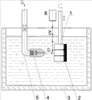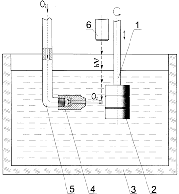 На валу привода поступательного и вращательного движения 1 закрепляют оксидируемую деталь 2, контактируют ее с анодом и погружают в стеклянную ванну 3 с водным раствором электролита, основными компонентами которого являются борная кислота (20,0-40,0 г/л), едкое кали (3,0-5,0 г/л) и метиленовый голубой (0,5-0,8 г/л). Деталь располагается в ванне так, чтобы оксидируемая поверхность в любой момент движения находилась на расстоянии 10-15 мм от заранее установленного жиклера 4 из нержавеющей стали, контактирующего с катодом и соединенного с трубопроводом 5, через который в жиклер подается под давлением кислород. Источник лазерного излучения 6 устанавливается так, чтобы излучение воздействовало на струю кислорода, выходящую из калиброванного отверстия жиклера и направленную на оксидируемую поверхность детали, на расстоянии 2-4 мм от данной поверхности.