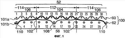 Также следует отметить, что, хотя каждая из основных нитей 101а, 101b, 201a, 201b, 301a и 301b вносит свой вклад в соответствующий раппорт рисунка слоя 56 с машинной стороны, никакая пара не формирует полный раппорт такого рисунка.
