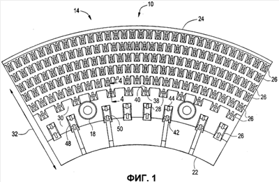 Каждый сегмент 14, 14 диспергирующей плиты имеет внутреннюю кромку 22 вблизи центра дисков 12, 12 и внешнюю кромку 24 вблизи периферии дисков 12, 12 . Остальная часть этого описания будет относиться к одному диспергирующему сегменту 14, 14 , но следует понимать, что все сегменты 14, 14 , которые образуют кольцевую плиту, предпочтительно, по существу подобны друг другу. Сегменты 14, 14 плиты имеют на ее поверхности 20 концентрические в радиальном направлении ряды 26 пирамид или зубцов 28. Поскольку диски 12, 12 и сегменты 14, 14 плиты вращаются, очищенный материал направляется в результате воздействия центробежной силы в радиальном направлении наружу от внутренней кромки 22 к наружной кромке 24 преимущественно по каналам 30, сформированным между соседними зубцами 28 в каждом из рядов 26.