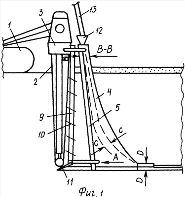 2. Устройство для строительства пластмассового дренажа, включающее базовую машину, активный рабочий орган, смонтированный на раме, лоток дренажной трубы с направляющей переменного сечения, бункер подачи дренажной трубы, представляющий собой короб, образованный двумя поперечными и двумя продольными вертикальными стенками, с передней режущей частью и лемехом, отличающееся тем, что между активным рабочим органом и бункером параллельно восходящей цепи смонтирована дополнительная рама, соединенная в верхней части с рамой активного рабочего органа, а в нижней – с бункером и профильным ножом, и снабженная отбойными открылками, установленными по ее высоте под углом 3-4° к горизонтали, при этом верхняя часть направляющей дренажной трубы выполнена с постоянным диаметром для прохода дренажной трубы с фильтром и экраном и через раструбную часть сопряжена с профильным лемехом.