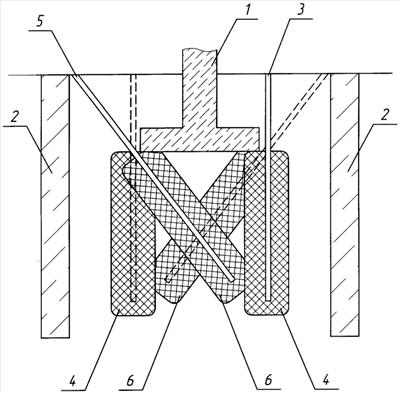 После окончания процесса закрепления грунта раствором, который нагнетали через наклонные скважины 5, сформировываются закрепленные зоны 6, которые в совокупности с закрепленными зонами 4 образуют практически единый закрепленный массив грунта под всем фундаментом 1 или под всем элементом фундамента (в зависимости от стоящей задачи).