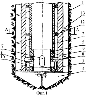 Способ осуществляется следующим образом. На поверхности собирается буровой снаряд в металлическом каркасе будущей сваи. При этом полую бурильную колонну 2 с переходником 5 опускают до нижнего основания металлического каркаса. Устанавливают выдвижные элементы 5 в горизонтальное положение, после чего при дальнейшем опускании бурильной колонны 2 выдвижные элементы 5 упираются в верхний торец опорной втулки 10 и заходят за арматурные прутки 9. На нижний конец переходника 5 наворачивают породоразрушающий инструмент 3 со складывающимися в осевом направлении рабочими элементами 4. Верхний конец бурового снаряда подсоединяют к ведущей штанге бурового агрегата (на фиг. не показаны) и производят проходку скважины 1. Скважина 1 проходится предлагаемым устройством с выносом разрушенной горной породы на поверхность промывочной жидкостью или сжатым воздухом до проектной глубины сваи с одновременным погружением металлического каркаса с вращением, передаваемым ему выдвижными шарнирными элементами 8, проходящими через арматурные прутки 9.