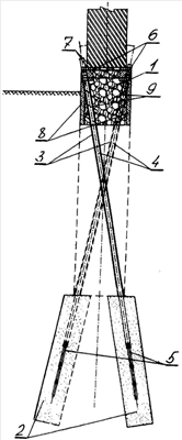 Сквозь тело существующего фундамента 1 бурят наклонные скважины с заходкой в грунт. Глубину заходки определяют в зависимости от конкретных условий: качества грунта, наличия грунтовых вод и проектных требований. Если не позволяют грунты, то бурение ведут с обсадной трубой. В пробуренные скважины вставляют направляющие трубы 3, например металлические. Через направляющую трубу 3 производят бурение и формируют грунтоцементную сваю 2. В пределах 12-ти часов с момента формирования грунтоцементной сваи (до момента ее полного схватывания) в направляющую трубу вставляют армирующий элемент, в качестве которого используют стальную трубу с диаметром, меньшим диаметра направляющей трубы, в частности, снабженную арматурным наконечником 5, например, из металлических стержней. Для придания конструкции прочности и увеличения сопротивления на изгиб трубу 4 заполняют пескобетоном, а зазоры между трубами 3 и 4 и между направляющей трубой 3 и фундаментом 1 заполняют инъекционным раствором. Существующий фундамент 1 снабжают железобетонным обвязочным поясом 6, сваренным с верхними частями направляющей трубы 3 и армирующего элемента 4. Обвязочный пояс 6 стягивают стяжками 7. В случае сильного разрушения существующий фундамент 1 забирают в железобетонную обойму 8, которую скрепляют с фундаментом 1 анкерами 9.