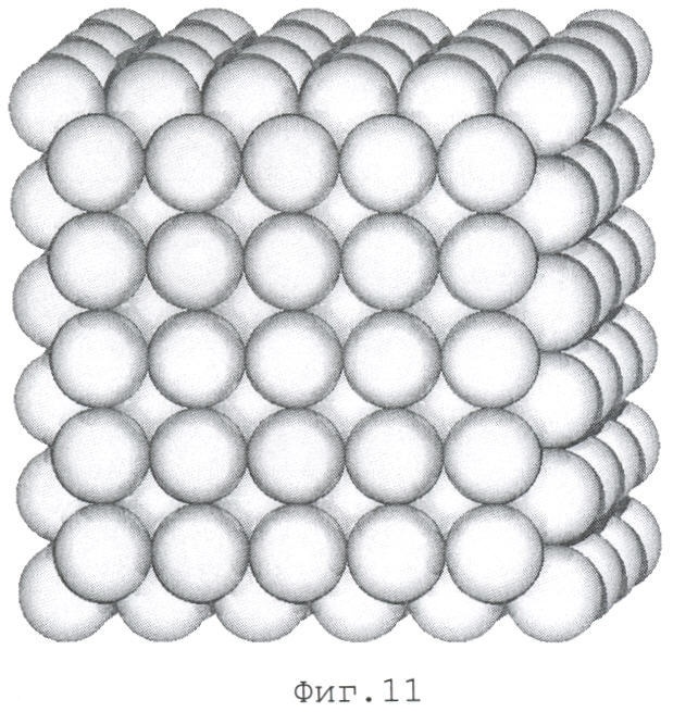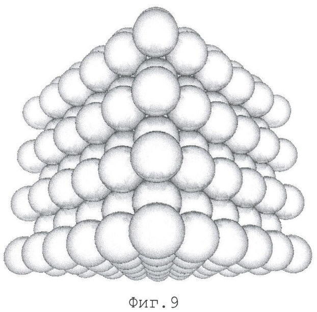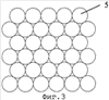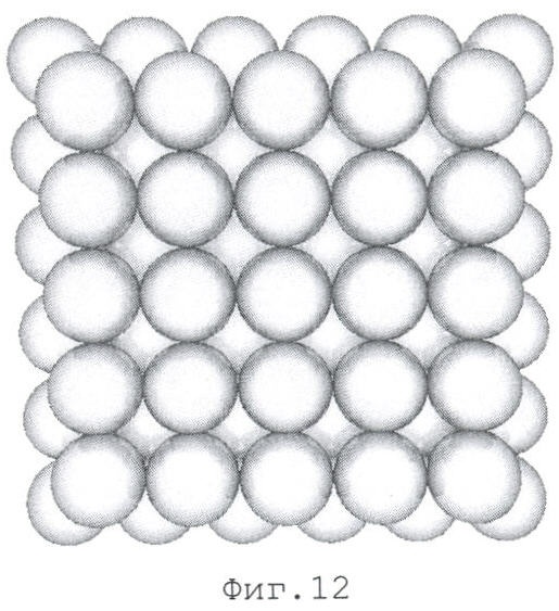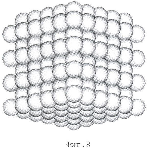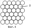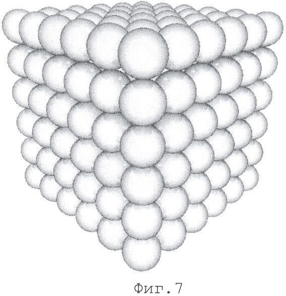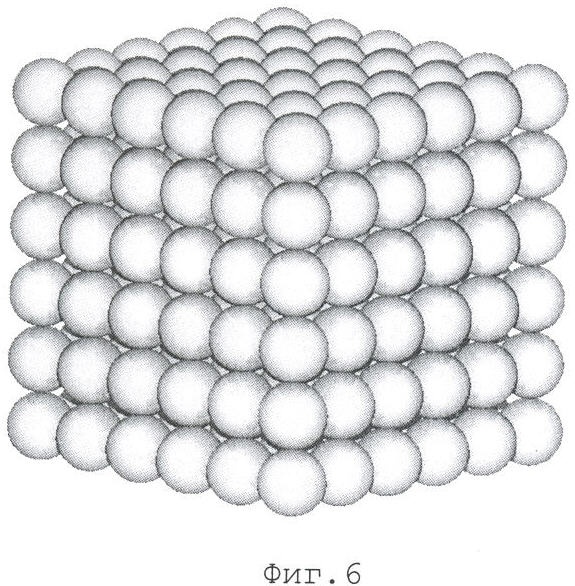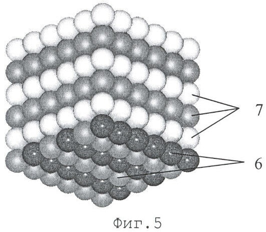 Упаковку одного слоя с квадратным (фиг.2) и треугольным (фиг.3, 4) расположением центров гранул 5 возможно создать на поверхности, расположенной горизонтально при одинаковой потенциальной энергии обоих упаковок любыми известными способами, например укладкой гомогенизированных гранул в порядке, определенном схемами упаковок.